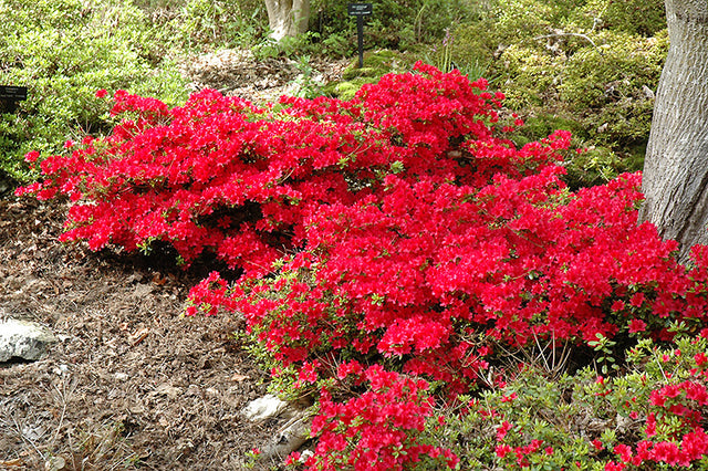 Striking crimson blooms cover this attractive dense compact shrub in mid spring; foliage is tiny giving a fine texture; ideal when massed in borders, foundation plantings, or low screening; absolutely must have well-drained, highly acidic and organic soil