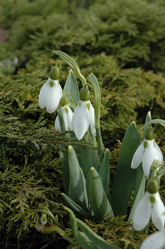 Snowdrops feature dainty nodding white bell-shaped flowers with green tips at the ends of the stems in early spring. Its grassy leaves remain grayish green in colour throughout the season.