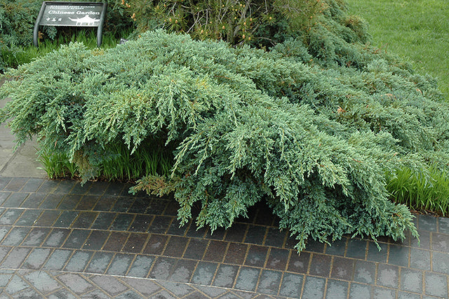 Blue Carpet Juniper will grow to be about 12 inches tall at maturity, with a spread of 5 feet. It tends to fill out right to the ground and therefore doesn't necessarily require facer plants in front. It grows at a slow rate, and under ideal conditions can be expected to live for 40 years or more.