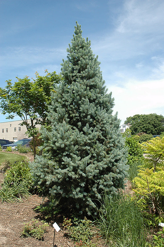 Upright Colorado Spruce will grow to be about 40 feet tall at maturity, with a spread of 15 feet. It has a low canopy with a typical clearance of 3 feet from the ground, and should not be planted underneath power lines. It grows at a slow rate, and under ideal conditions can be expected to live for 80 years or more.