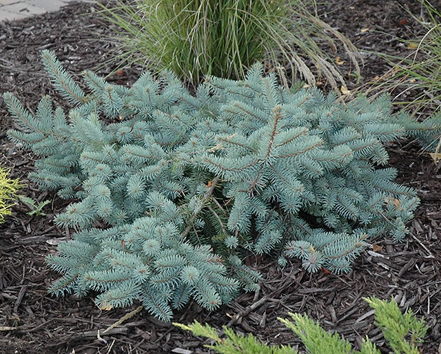 Colorado Blue Spruce or Procumbens Spruce is a dwarf conifer which is primarily valued in the garden for its broadly spreading habit of growth. It has attractive silvery blue evergreen foliage. The needles are highly ornamental and remain silvery blue throughout the winter.