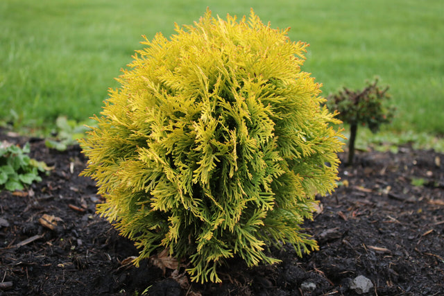 Harvest Moon Globe Cedar, also known as Harvest Moon Arborvitae, features thick, golden-yellow foliage enveloping its naturally dome-shaped form. This robust evergreen conifer performs well in humid climates and is ideal for low hedges or enhancing the base layers of your landscape. Paired with vibrant green evergreens, its striking golden hue creates a distinctive contrast that elevates garden aesthetics.