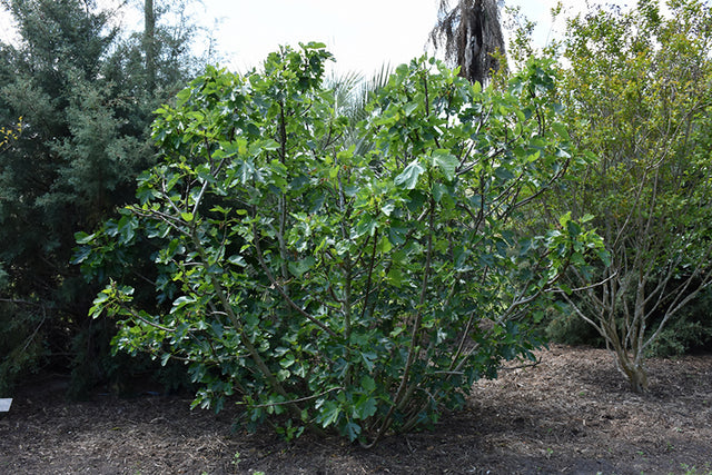 Ischia Fig will grow to be about 10 feet tall at maturity, with a spread of 10 feet. It has a low canopy with a typical clearance of 1 foot from the ground, and is suitable for planting under power lines. It grows at a medium rate, and under ideal conditions can be expected to live for 50 years or more.
