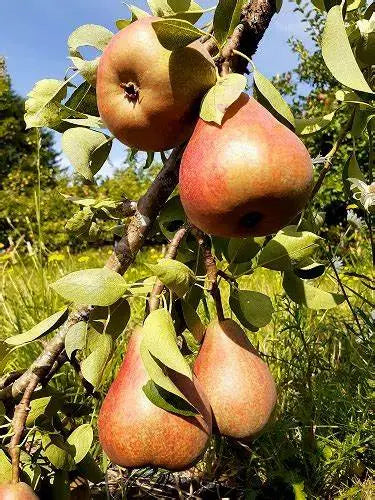The Rescue Semi Dwarf Pear produces sizable yellow fruit accented with a vivid red-orange blush. Its flesh is sweet, tender, and juicy, featuring a notably small core ideal for canning. This variety is resistant to scab and has excellent storage qualities.