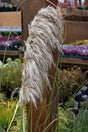 Ivory Feathers® Pampas Grass will grow to be about 5 feet tall at maturity extending to 8 feet tall with the flowers, with a spread of 6 feet. Its foliage tends to remain dense right to the ground, not requiring facer plants in front. It grows at a fast rate, and under ideal conditions can be expected to live for approximately 10 years. As an herbaceous perennial, this plant will usually die back to the crown each winter, and will regrow from the base each spring. Be careful not to disturb the crown in late winter when it may not be readily seen! This is a dioecious species, meaning that individual plants are either male or female. Only the females will produce fruit, and a male variety of the same species is required nearby as a pollinator.