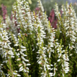 Calluna vulgaris 'Alicia' produces pure white blossoms from late summer into early fall. It features upright stems adorned with small, vibrant green leaves. Thrives in sandy, acidic soil that is moderately moist and well-drained. Perfect for use as ground cover, in flower beds and borders, on slopes and banks, as well as in rock gardens or containers.
