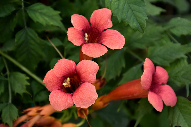 Flamenco Trumpetvine will grow to be about 40 feet tall at maturity, with a spread of 24 inches. As a climbing vine, it tends to be leggy near the base and should be underplanted with low-growing facer plants. It should be planted near a fence, trellis or other landscape structure where it can be trained to grow upwards on it, or allowed to trail off a retaining wall or slope. It grows at a fast rate, and under ideal conditions can be expected to live for approximately 20 years.