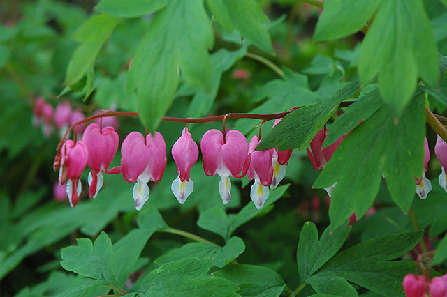 Common Bleeding Heart will grow to be about 3 feet tall at maturity, with a spread of 3 feet. When grown in masses or used as a bedding plant, individual plants should be spaced approximately 30 inches apart. It grows at a medium rate, and under ideal conditions can be expected to live for approximately 15 years. As an herbaceous perennial, this plant will usually die back to the crown each winter, and will regrow from the base each spring. Be careful not to disturb the crown in late winter when it may not be readily seen! As this plant tends to go dormant in summer, it is best interplanted with late-season bloomers to hide the dying foliage.