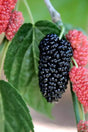 Black Beauty Mulberry produce large, juicy, exceptionally flavorful black berries each year. Eat the fruit fresh, or dry it for snacking later. The tree grows quickly to about 15', shorter than average for a mulberry, but can be pruned hard each year and kept much smaller.