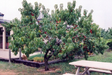 Hardy Red Nectarine will grow to be about 20 feet tall at maturity, with a spread of 25 feet. It has a low canopy with a typical clearance of 3 feet from the ground, and is suitable for planting under power lines. It grows at a medium rate, and under ideal conditions can be expected to live for 40 years or more. While it is considered to be somewhat self-pollinating, it tends to set heavier quantities of fruit with a different variety of the same species growing nearby.