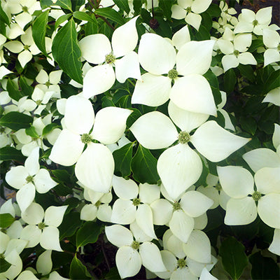 Greensleeves Dogwood is widely viewed by experts to be one of the best varieties of Korean dogwood. It is a strong and robust grower with handsome foliage and abundant, large, creamy white flowers with a hint of green in late spring and early summer. The deep green waxy foliage makes a wonderful backdrop for the masses of bright red, edible, strawberry-like fruit in late summer and fall. The foliage then turns to bold shades of red and purple in autumn. It will eventually reach 15-20 feet tall and wide. Attracts butterflies in spring and birds to the fruit in fall. Deer resistant.