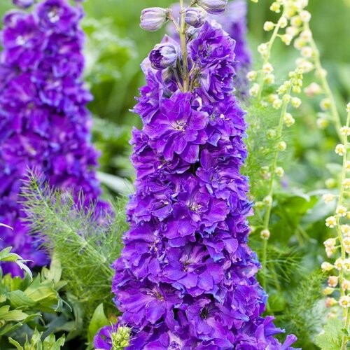 Delgenius Kingsley Larkspur is a new member of the Delgenius collection, showcasing semi-double royal purple flowers edged in vibrant electric blue. The flower’s center mirrors this rich purple shade, enhancing its visual appeal. Consistent with other Delgenius varieties, Kingsley presents a compact growth habit with numerous flower spikes, preserving the distinctive characteristics of the series.