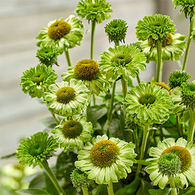 Sunseekers Green Apple Coneflower is a coneflower with the most unusual semi-double flowers emerging apple green later developing white highlights all surrounding a large fragrant cone. Part of the Sunseekers collection bred for exceptional vigour, masses of non-fading flowers, and a dense, compact growth habit of less than two feet tall and wide. Plant in full sun in average (not overly rich), well-drained soils. Avoid soils that are overly moist in winter. Great winter interest and seeds for over-wintering birds.