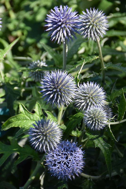 Veitch's Blue Globe Thistle features bold powder blue pincushion flowers at the ends of the stems from early summer to early fall. The flowers are excellent for cutting. Its attractive spiny lobed leaves remain steel blue in colour with curious silver undersides throughout the season.