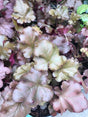 Boysenberry Coral Bells is a clump-forming, semi-evergreen perennial bearing rounded, ruffled, lobed, red / brown leaves and slender, upright stems bearing panicles of small, bell-shaped, white flowers from late spring into summer.