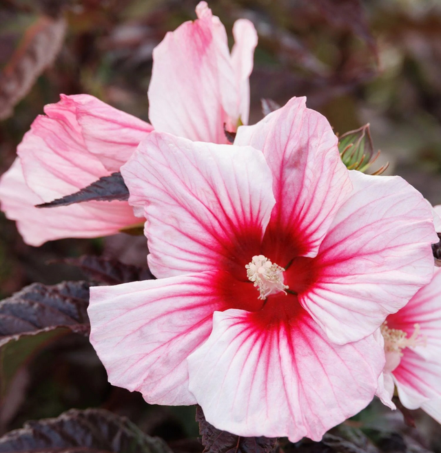 Moonshadow Rosita Hibiscus has big, lightly blushing blooms with a deep crimson center contrast against the dark, purple-black foliage on a densely branched, compact plant. Breaks dormancy and blooms several weeks earlier than other varieties, with a heavy flower set. A beautiful addition to perennial borders, or excellent in planters.