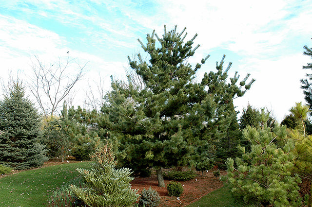 Tempelhof Japanese White Pine will grow to be about 40 feet tall at maturity, with a spread of 40 feet. It has a low canopy with a typical clearance of 4 feet from the ground, and should not be planted underneath power lines. It grows at a medium rate, and under ideal conditions can be expected to live to a ripe old age of 100 years or more; think of this as a heritage tree for future generations!