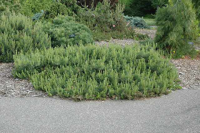 Hillside Creeper Scotch Pine will grow to be about 24 inches tall at maturity, with a spread of 7 feet. It tends to fill out right to the ground and therefore doesn't necessarily require facer plants in front. It grows at a medium rate, and under ideal conditions can be expected to live for 40 years or more.
