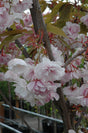 Shirofugen Flowering Cherry will grow to be about 35 feet tall at maturity, with a spread of 30 feet. It has a low canopy with a typical clearance of 4 feet from the ground, and should not be planted underneath power lines. It grows at a medium rate, and under ideal conditions can be expected to live for 50 years or more.