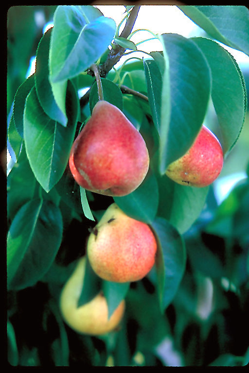 Summercrisp Pear is clothed in stunning clusters of white flowers with purple anthers along the branches in mid spring. It has dark green deciduous foliage. The glossy oval leaves turn an outstanding burgundy in the fall. The fruits are showy chartreuse pears with a red blush, which are carried in abundance in late summer. The fruit can be messy if allowed to drop on the lawn or walkways, and may require occasional clean-up.