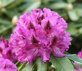 Colonel Coen Rhododendron is covered in stunning clusters of lightly-scented purple trumpet-shaped flowers with burgundy spots at the ends of the branches in mid spring. It has dark green evergreen foliage which emerges green in spring. The glossy narrow leaves remain dark green throughout the winter.