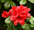 The Elizabeth Hobbie Rhododendron features funnel-shaped flowers about 2 inches wide, displaying a vivid red color with pronounced red edges and subtle red spotting. Its leaves are rounded, dark green, and have a matte finish. This variety grows with a dense, compact form but can become leggy as it matures.