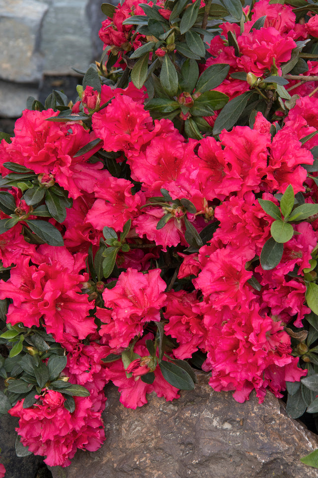 Holden's Raspberry Ruffles Rhododendron is a compact, spreading evergreen featuring glossy, dark foliage. Its buds open into a vibrant display of fuchsia flowers, creating striking visual appeal from mid-May. The colorful buds also add captivating interest throughout winter. This classic shrub is a valuable addition to any spring garden, particularly effective in shaded areas or borders for a burst of bright color.