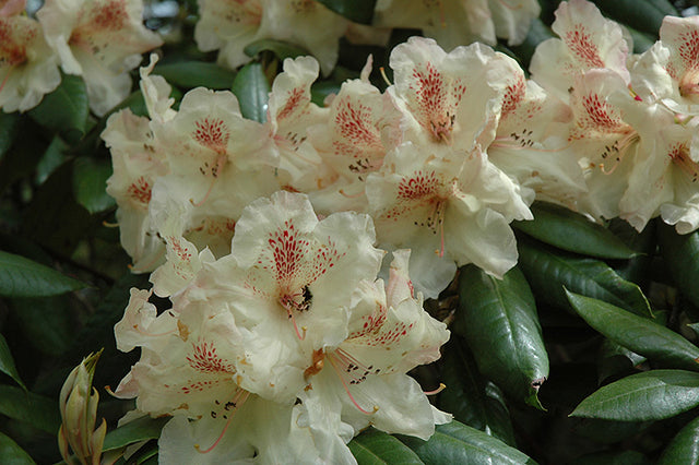 Mrs. Betty Robertson Rhododendron is covered in stunning clusters of lightly-scented creamy white trumpet-shaped flowers with shell pink overtones, buttery yellow throats and red spots at the ends of the branches in mid spring. It has dark green evergreen foliage. The glossy narrow leaves remain dark green throughout the winter.