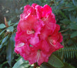 The Red Walloper Rhododendron features striking red flowers that gradually transition through rose hues to soft pastel pink. It has large, deep green leaves and an open growth habit, making it a robust and vigorous plant.