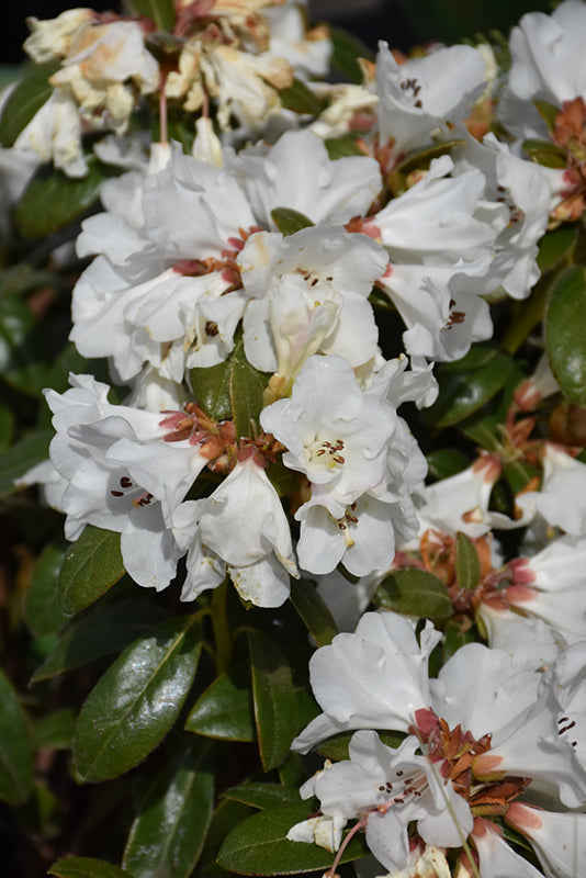 This shrub does best in full sun to partial shade. You may want to keep it away from hot, dry locations that receive direct afternoon sun or which get reflected sunlight, such as against the south side of a white wall. It requires an evenly moist well-drained soil for optimal growth, but will die in standing water. It is very fussy about its soil conditions and must have rich, acidic soils to ensure success, and is subject to chlorosis (yellowing) of the foliage in alkaline soils. It is somewhat tolerant of urban pollution, and will benefit from being planted in a relatively sheltered location. Consider applying a thick mulch around the root zone in winter to protect it in exposed locations or colder microclimates. This particular variety is an interspecific hybrid.