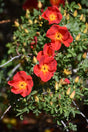 A popular flowering shrub that bears uniquely distinctive single copper-scarlet flowers with yellow centers in early summer; wide, rounded habit, resistant to disease, considered one of the most beautiful of all roses; needs full sun and well-drained soil