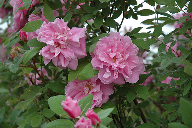 Considered by many to be the very hardiest garden rose, this imposing specimen is smothered in fragrant double pink flowers in early summer and repeating; a vigorous plant with an upright habit, resistant to disease; needs full sun and well-drained soil