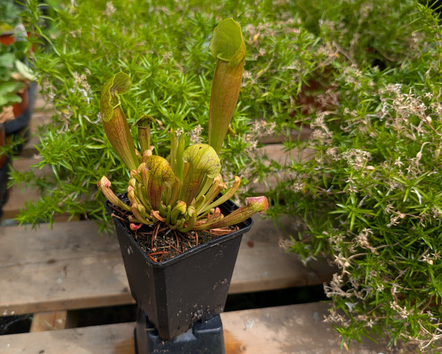 Sarracenia ‘Barba Green’ forms upright, tubular pitchers ranging from 12–20" tall. The pitchers are a vibrant, almost fluorescent green with smooth, lightly veined sides and a flared hood that shades the trap opening. This bold coloration remains consistent even in intense sun, making the plant a standout in any carnivorous collection. In mid to late spring, a solitary flower appears on a 16–24" stalk. The flower is chartreuse to yellow-green and nods downward, with five rounded petals and a distinct umbrella-like style.