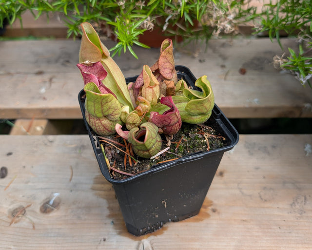 Venosa Pitcher Plant's compact rosettes 8–12 " wide form squat, jug‑shaped pitchers 4–8 " tall with flared hoods, richly veined in green, burgundy, and bronze. Each spring a single, nodding, 1.5–2" across flower rises 8–12" on a sturdy stalk; the blossom bears five rounded petals in deep maroon‑red, releasing a sweet fragrance that attracts early pollinators.