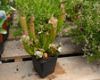 Sarracenia ‘Velet’ features elegant, upright pitchers reaching 10–18" tall, with narrow tubes and a ruffled hood. The pitcher body is flushed with deep burgundy to wine-red tones, often accented with subtle veining and darker lids, giving the plant a velvety, polished appearance. In spring, the plant produces a nodding, 2–2.5" wide flower on an 18–24" stalk. The petals are deep rose to reddish-purple and slightly reflexed, blooming for several weeks and offering a pleasant fragrance that attracts pollinators.