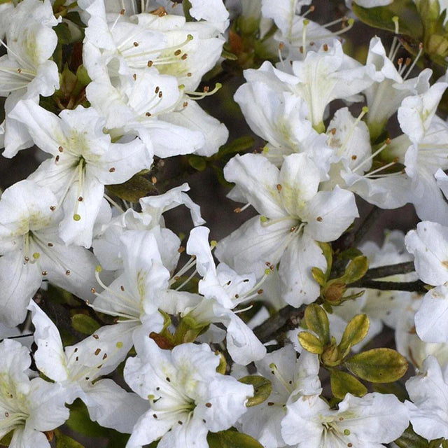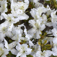 This evergreen azalea produces a dense, compact shrub with light green leaves in spring that turn purple in fall. Known for its resilience and classic appeal, it showcases large, pure white blossoms subtly dotted with light green. Ideal for ericaceous garden beds or container planting on a patio.