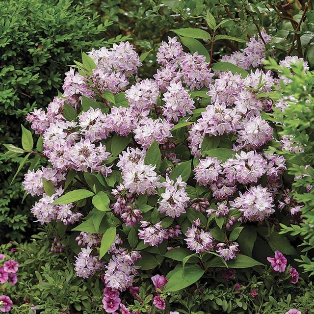 Deutzia 'Raspberry Sundae' produces larger, more vivid flowers compared to other Deutzia varieties. Its pink-purple blooms densely cover the elegantly arching branches and bloom repeatedly from mid-spring through midsummer. With a subtle fragrance, it attracts abundant bees and butterflies. This easy-care shrub thrives in moist, well-drained soil with full to partial sunlight, preferring warm, sunny locations. It’s naturally compact, reaching approximately 4 feet in height and width, making it ideal for borders, patio containers, or any confined garden space.