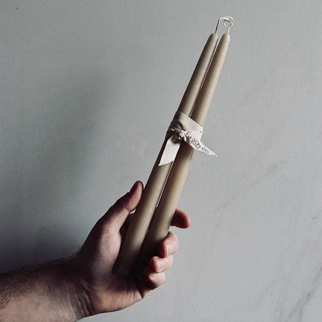 Handcrafted and hand-over dipped in Canada for Farmer's Son Co., the fragrance-free modern dipped tapers are the perfect way to add a flickering soft, warm light to any setting. They are clean burning for ease of enjoyment. The outer portion of the taper candles are made of an extremely hard-shell crafted with the highest quality food-grade paraffin wax and a cotton wick. This prevents the candle from dripping. The base of the tapers also fit any standard taper holder. Burn-time enjoyment of approximately nine hours per candle. Set of two 12 inch taper candles wrapped in Farmer's Son Co. ribbon; candle holders not included. Never burn a taper candle to the very bottom of the holder. Always store candles in a cool, dark, dry place. Store flat to prevent warping. Always keep wicks trimmed to 1/4” (0.63 cm) long. Long or crooked wicks cause uneven burning and dripping.