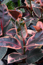 Ruby Rubber Tree's attractive glossy oval leaves remain dark green in colour with showy creamy white variegation and tinges of ruby-red throughout the year on a plant with an upright spreading habit of growth.
