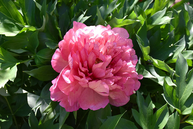 Hillary Peony features bold lightly-scented semi-double coral-pink flowers with pink overtones and a buttery yellow flare at the ends of the stems in late spring. The flowers are excellent for cutting. Its compound leaves remain dark green in colour throughout the season.