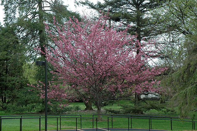 Royal Burgundy Flowering Cherry is a deciduous tree with an upright spreading habit of growth. Its average texture blends into the landscape but can be balanced by one or two finer or coarser trees or shrubs for an effective composition.