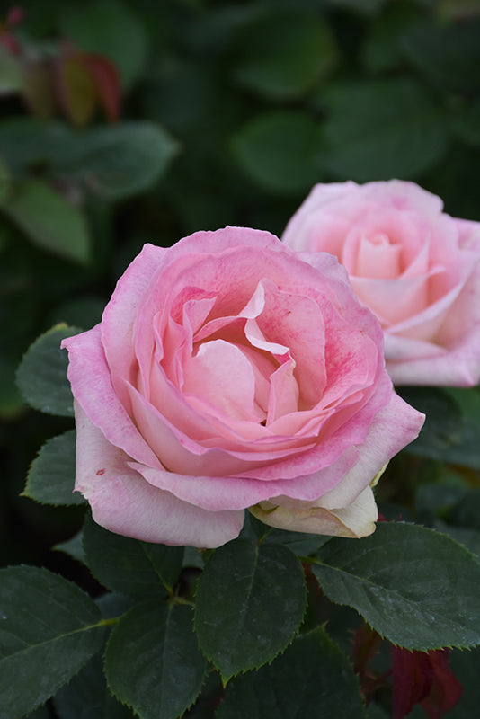Painted Porcelain™ Rose features showy fragrant double pink flowers with white overtones and a creamy white reverse at the ends of the branches from late spring to mid fall. The flowers are excellent for cutting. It has dark green deciduous foliage. The oval compound leaves turn yellow in fall.