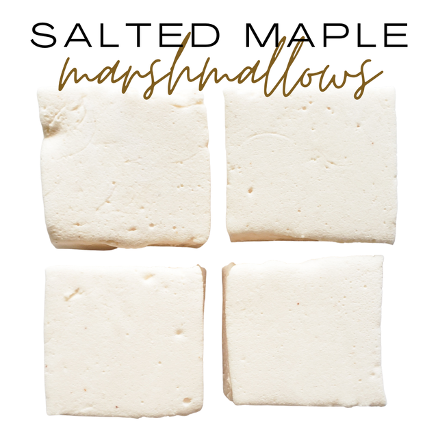 Here for the summer! Maple flavoured marshmallows with a kiss of saltiness. This mallow is a favourite for snacking, dunking in your hot chocolate or morning coffee, or roasting over the campfire.