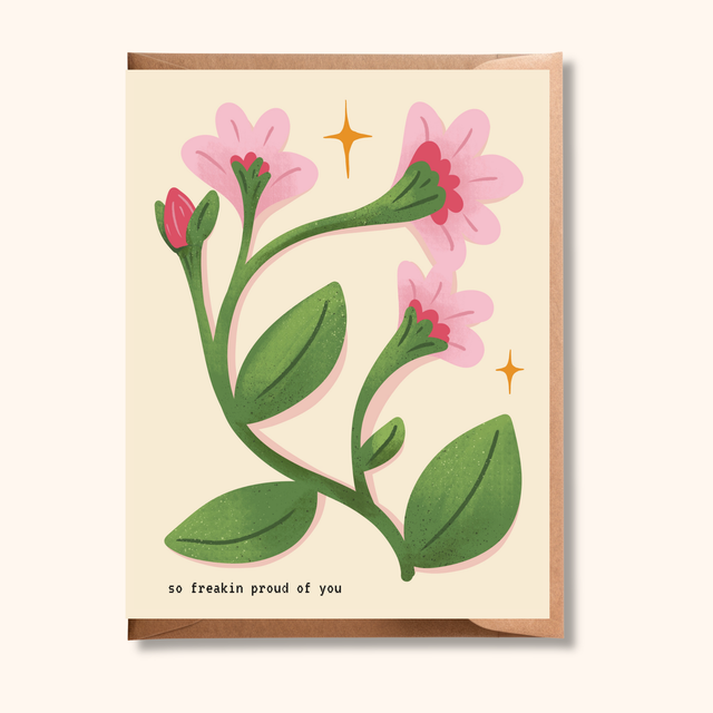 A digital illustration of pink flowers on a beige background. Perfect for promotions, big life changes, graduation, and more! A versatile option for birthdays, graduations, promotions, or any moment worth celebrating, this card blends encouragement with visual charm.