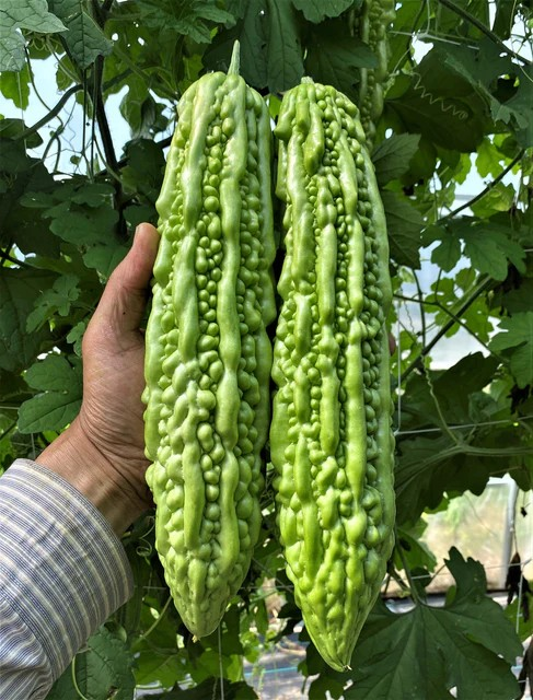 A Vietnamese-type bitter gourd, also known as balsam pear and bitter melon, Green Pearl is early to ripen its 22-30cm (9-12”) shiny green, warty fruit. Scrape the white seeds and pith out and chop into bite size pieces for use in soups and stir fries. Grow on a trellis for straight fruit.