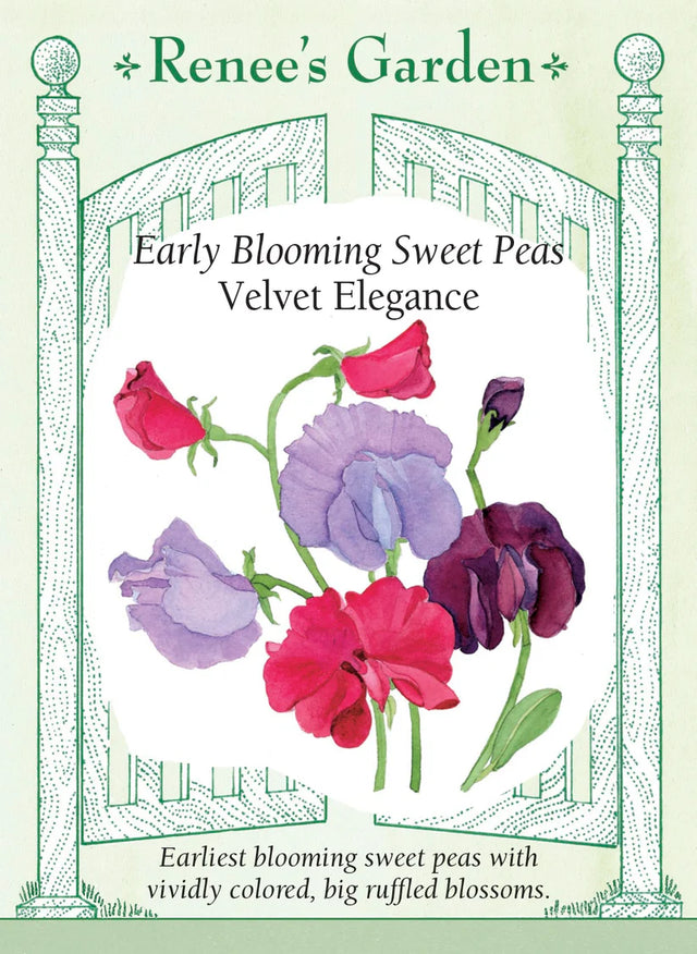 Day-length neutral Elegance sweet peas are specially bred to reliably bloom several weeks earlier than any other sweet pea. Our strikingly beautiful Velvet Elegance showcases a trio of new colors; rich dark maroon, deep violet-blue and full crimson-red. These large and beautifully formed ruffled flowers bloom on vigorous long stems and the effect of their vivid colors in the landscape or in bouquets is completely arresting; like a royal velvet tapestry.