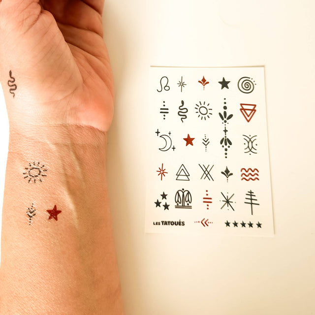 Small tattoos, very discreet, very cute, to put on the fingers, in the shot, like a jewel. Includes one sheet of the cutest temporary tattoos.