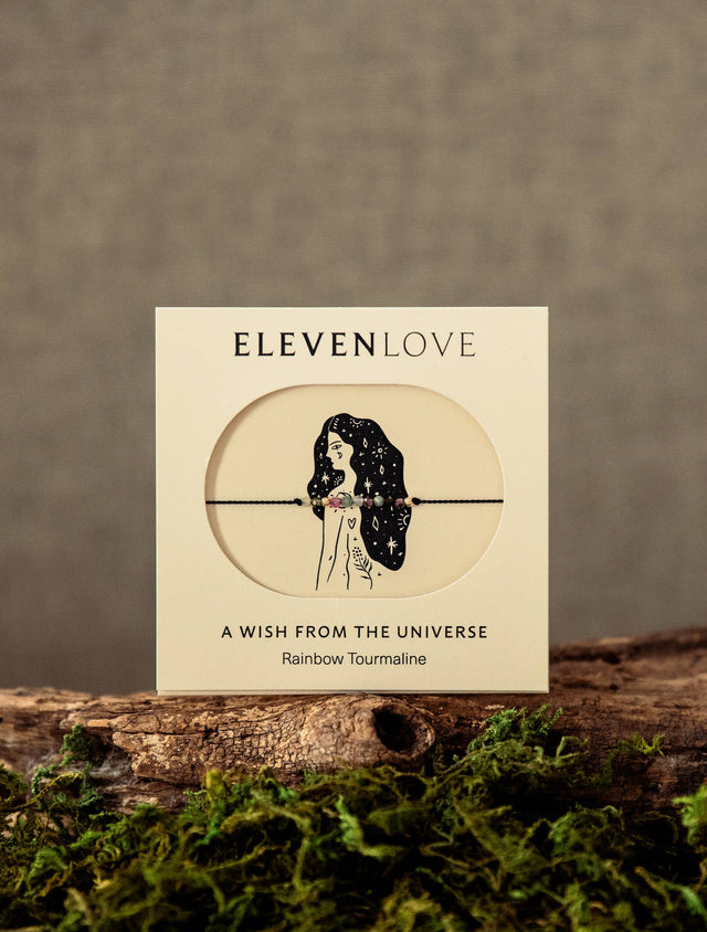 Beautiful, dainty and minimalistic string bracelet made from 100% silk string and 2-3mm natural faceted rainbow tourmaline. 11 crystals in total. Special wish from the universe written on the back of the card. Recite this special wish as you tie the bracelet on.