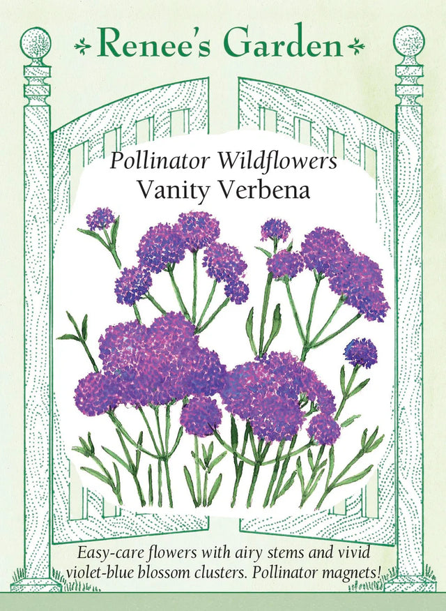 Vanity is a new compact cultivar of a perennial favorite wildflower, offering brilliant color, a long flowering season and constant pollinator visits especially from summer butterflies. This award-winning variety has an open habit with gorgeous, intense purple-blue clusters atop branching thin, wiry stems. With its garden friendly compact size of 2-2 1/2 feet, Vanity is the most versatile Verbena bonariensis; plant in borders, or in containers for a patio or terrace. Its eye-catching, vivid blossoms make fabulous color accents in mixed bouquets.