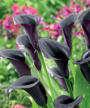 The Captain Odessa Calla Lily features striking, deep purple-black, trumpet-shaped blooms set against bright green, white-spotted, lance-shaped foliage. This hybrid variety emerges from dormancy in mid to late spring after sufficient warmth, blooming profusely from summer through fall. Preferring consistently moist conditions, it can also thrive as a marginal aquatic. Apply fertilizer every two months until flowering ends. Ideal for borders, containers, and floral arrangements, it is hardy in coastal BC with proper drainage and winter protection or storage. Additionally, it attracts pollinators and resists deer and rabbits.
